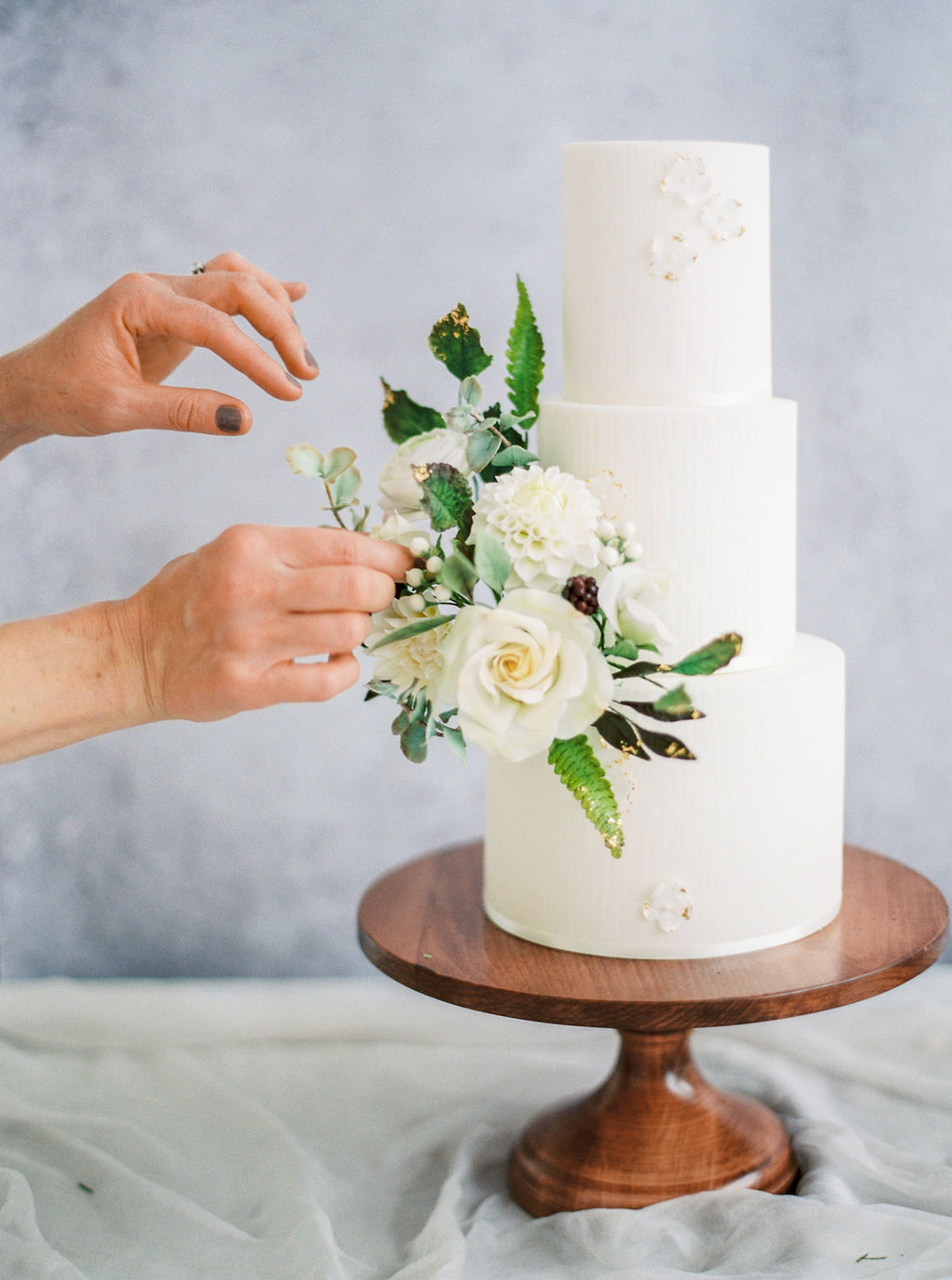 Att dekorera bröllopstårtan med färska blommor är både trendigt och vackert.